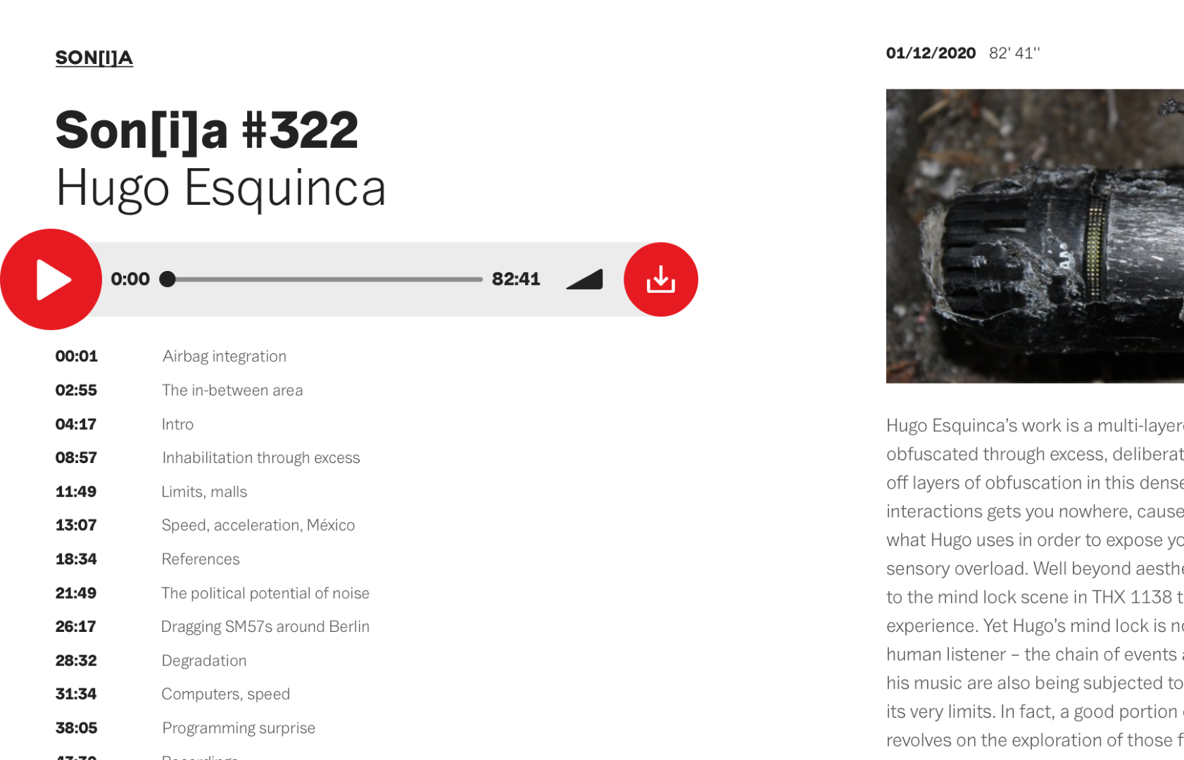Son[i]a is a radio programme that functions as a mirror and a sounding board for MACBA (Museu d’Art Contemporani de Barcelona). Harnessing the synergies arising from the presence of the many voices, activities, and sounds that circulate in the museum, Son[i]a presents in-depth interviews with artists, curators, critics, activists, and thinkers, on a range of topics ranging from art to philosophy, by way of politics, activism, artistic research, music, and film, and everything in between.